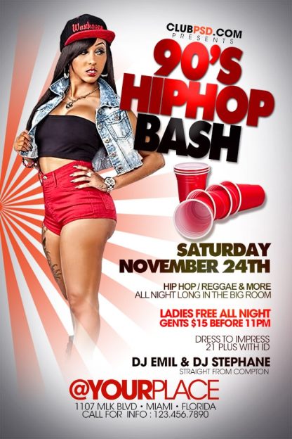After buying this 1990’s flyer with Paypal or your credits, you will download an easily customizable PSD for your next party.