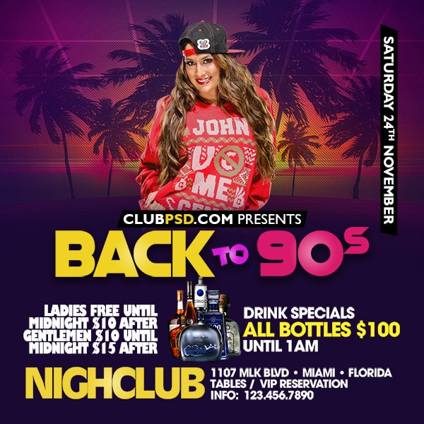 Download this exclusive 1990's template to promote your next party. Fully editable PSD with photoshop, this professional flyer will attract your guests.