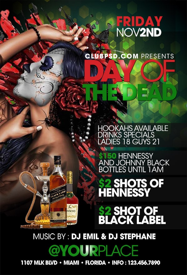 After buying this Day of the Dead flyer with Paypal or your credits, you will download an easily customizable PSD for your next party.
