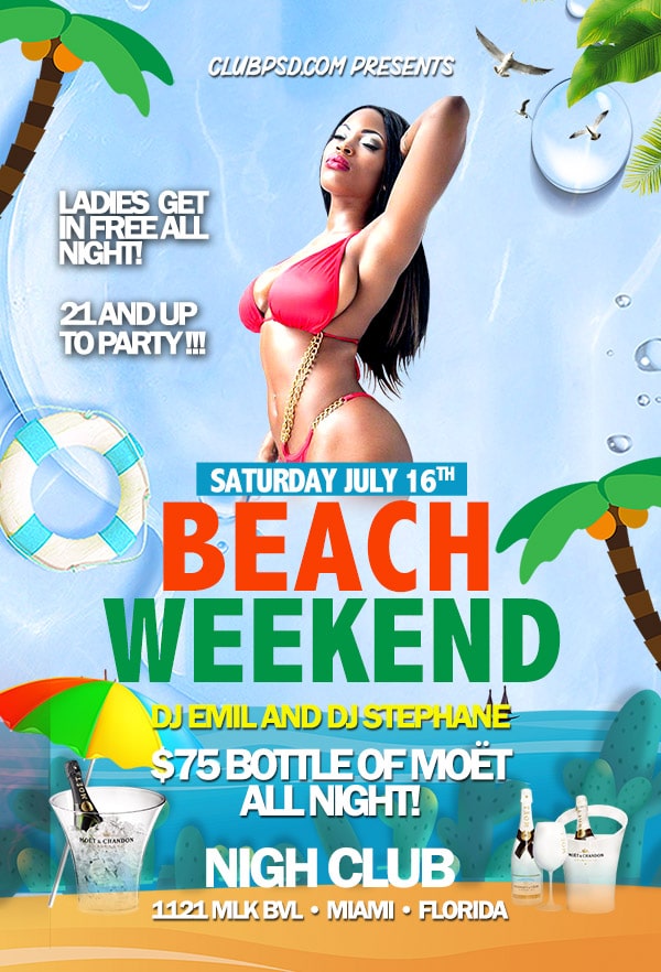 After buying this Beach flyer with Paypal or your credits, you will download an easily customizable PSD for your next party.