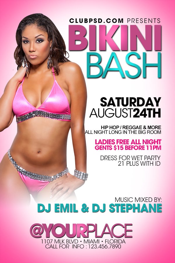 After buying this Bikini flyer with Paypal or your credits, you will download an easily customizable PSD for your next party.