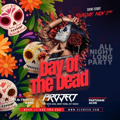 After buying this Day of the Dead flyer with Paypal or your credits, you will download an easily customizable PSD for your next party.