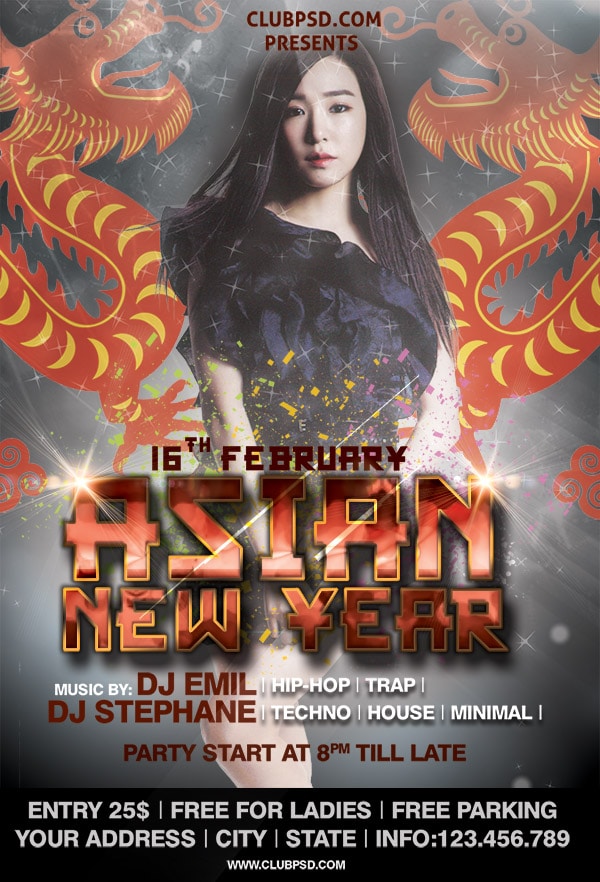 After buying this Asian Party flyer with Paypal or your credits, you will download an easily customizable PSD for your next party.