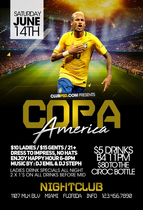 After buying this Copa America flyer with Paypal or your credits, you will download an easily customizable PSD for your next party.