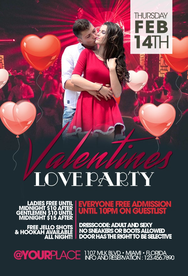 After buying this Valentines flyer with Paypal or your credits, you will download an easily customizable PSD for your next party.