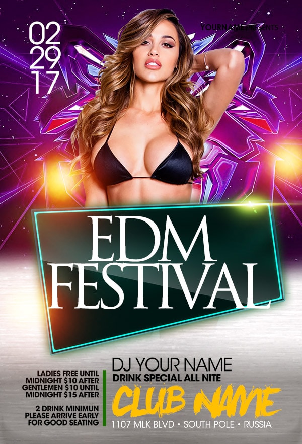 After buying this EDM flyer with Paypal or your credits, you will download an easily customizable PSD for your next party.