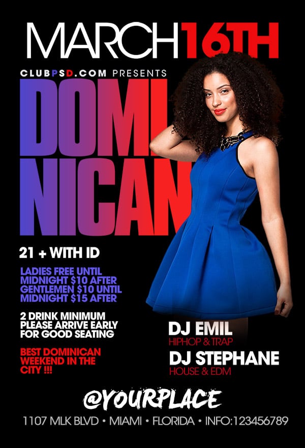 After buying this Dominican flyer with Paypal or your credits, you will download an easily customizable PSD for your next party.