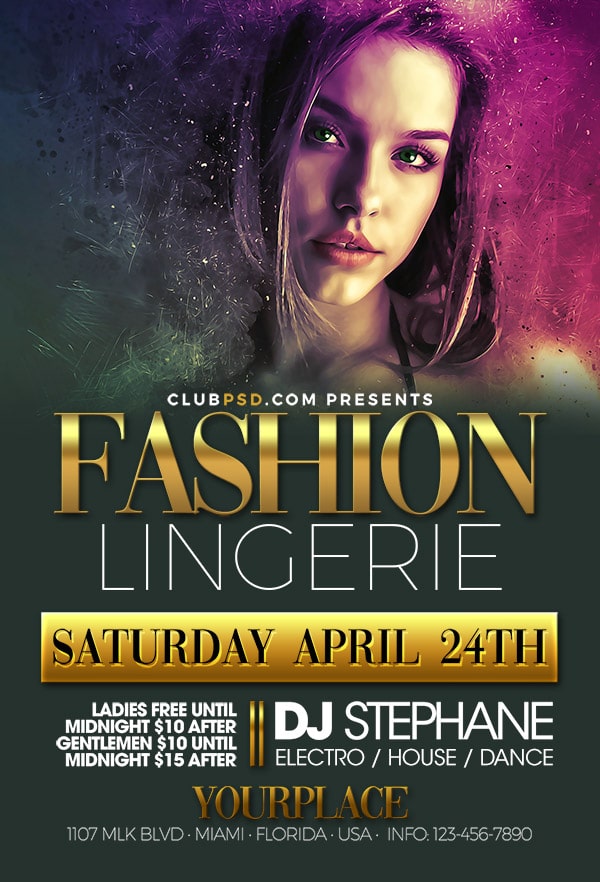 After buying this Fashion & Lingerie flyer with Paypal or your credits, you will download an easily customizable PSD for your next party.