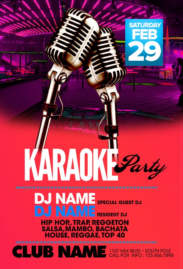 Download this exclusive Karaoke template to promote your next party. Fully editable PSD with photoshop, this professional flyer will attract your guests.