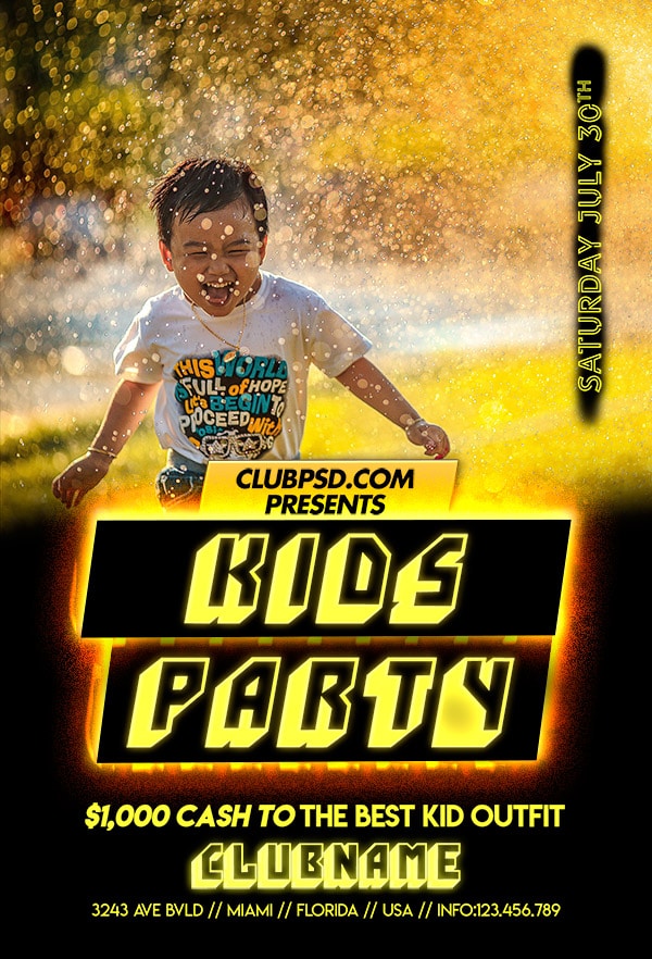 After buying this Kids flyer with Paypal or your credits, you will download an easily customizable PSD for your next party.