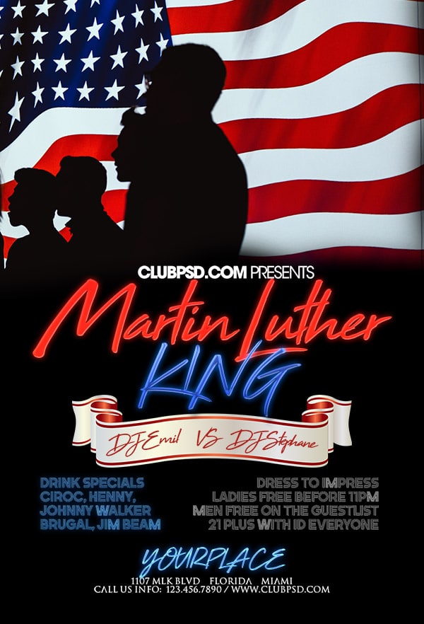 After buying this Martin Luther King flyer with Paypal or your credits, you will download an easily customizable PSD for your next party.