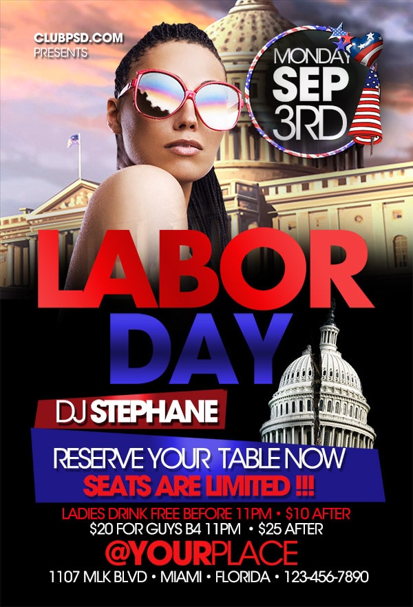 After buying this Labor day flyer with Paypal or your credits, you will download an easily customizable PSD for your next party.