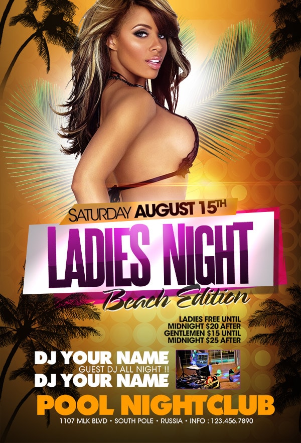 After buying this Ladies Night flyer with Paypal or your credits, you will download an easily customizable PSD for your next party.
