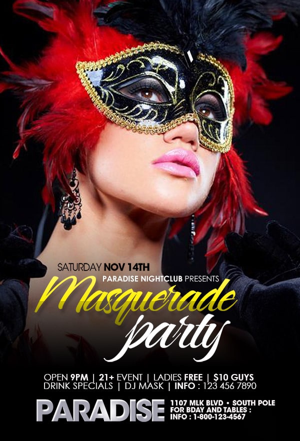 After buying this Costume & Masquerade flyer with Paypal or your credits, you will download an easily customizable PSD for your next party.
