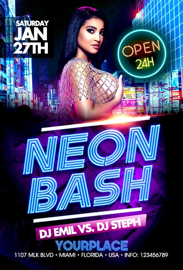 After buying this Neon party flyer with Paypal or your credits, you will download an easily customizable PSD for your next party.