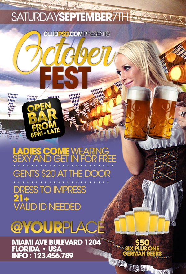 Download this exclusive Oktoberfest template to promote your next party. Fully editable PSD with photoshop, this professional flyer will attract your guests.