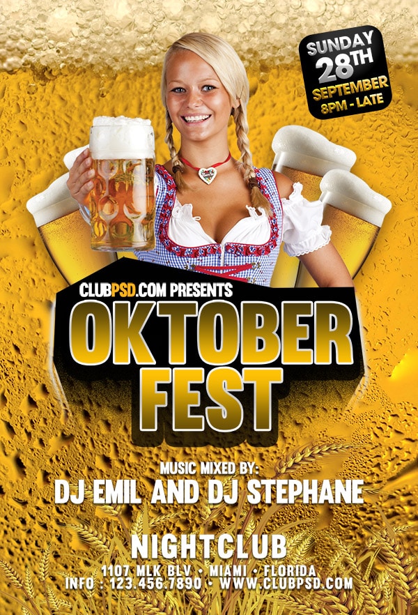 Download this exclusive Oktoberfest template to promote your next party. Fully editable PSD with photoshop, this professional flyer will attract your guests.