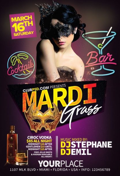 After buying this Mardi gras flyer with Paypal or your credits, you will download an easily customizable PSD for your next party.