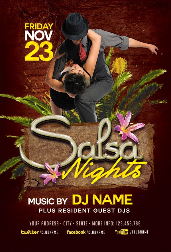 After buying this Bachata flyer with Paypal or your credits, you will download an easily customizable PSD for your next party.