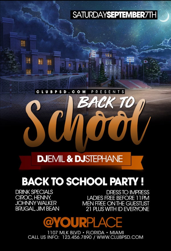 After buying this School Party flyer with Paypal or your credits, you will download an easily customizable PSD for your next party.