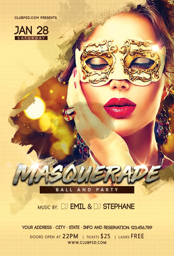 After buying this Costume & Masquerade flyer with Paypal or your credits, you will download an easily customizable PSD for your next party.