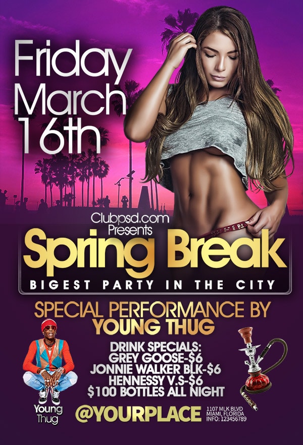 After buying this Spring Break flyer with Paypal or your credits, you will download an easily customizable PSD for your next party.
