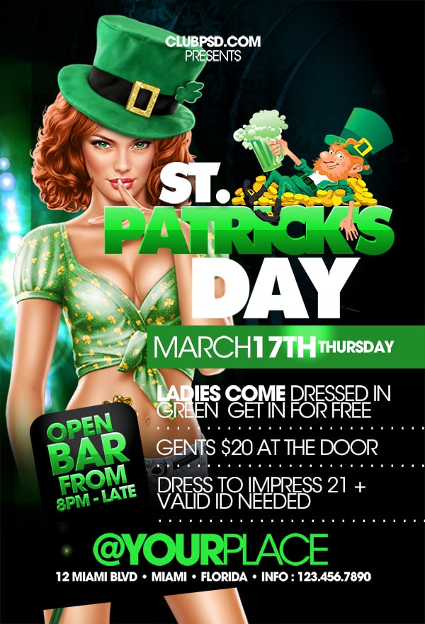Download this exclusive St Patricks day template to promote your next party. Fully editable PSD with photoshop, this professional flyer will attract your guests.