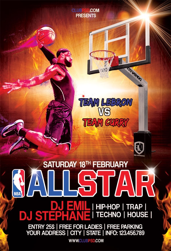 Download this exclusive Basketball & NBA template to promote your next party. Fully editable PSD with photoshop, this professional flyer will attract your guests.