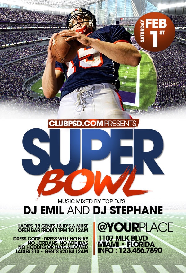 After buying this Football & Super Bowl flyer with Paypal or your credits, you will download an easily customizable PSD for your next party.