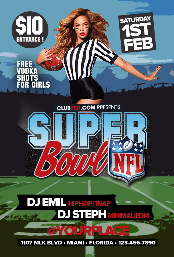 After buying this Football & Super Bowl flyer with Paypal or your credits, you will download an easily customizable PSD for your next party.
