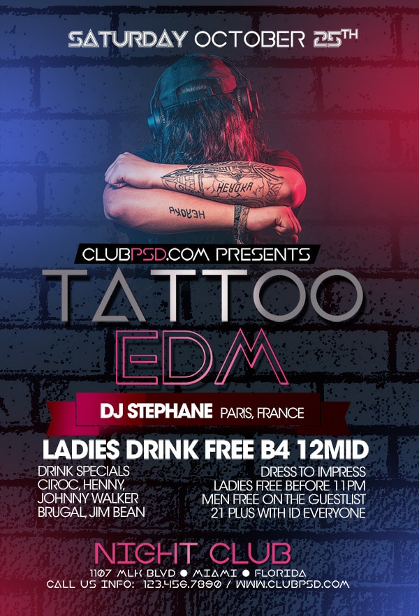 After buying this Tattoo flyer with Paypal or your credits, you will download an easily customizable PSD for your next party.