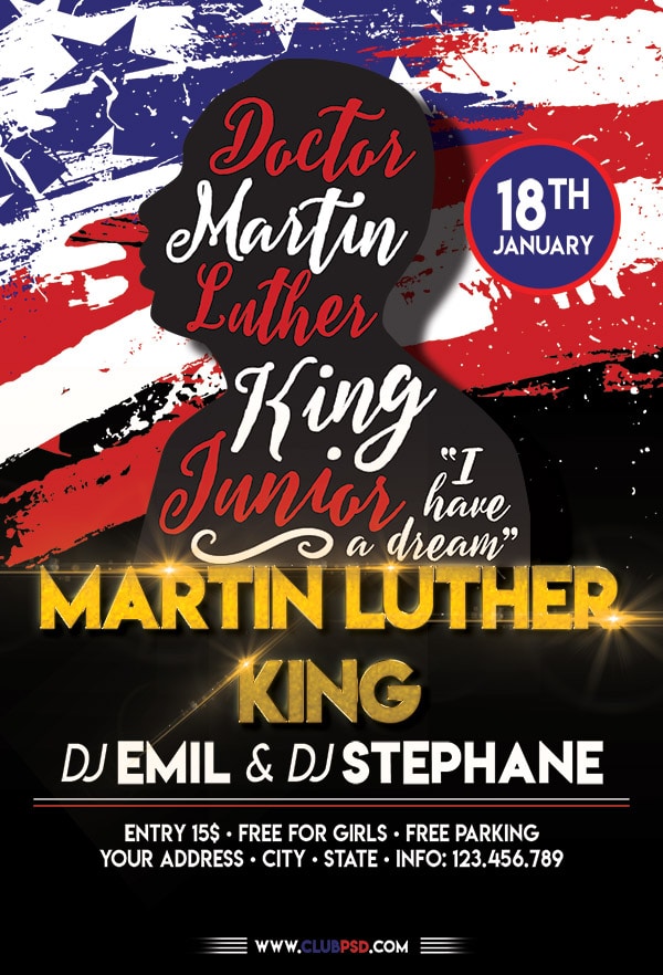 After buying this Martin Luther King flyer with Paypal or your credits, you will download an easily customizable PSD for your next party.