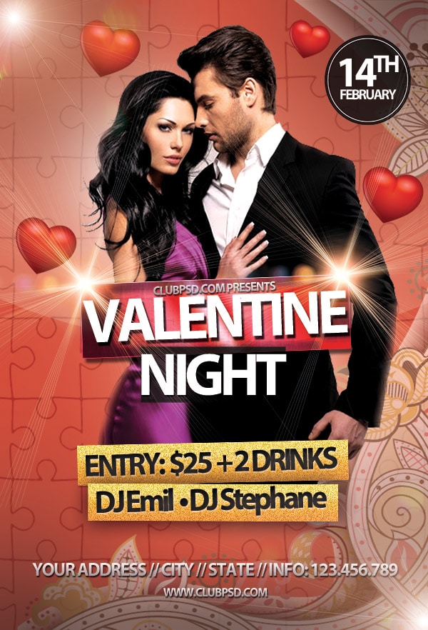 After buying this Valentines flyer with Paypal or your credits, you will download an easily customizable PSD for your next party.